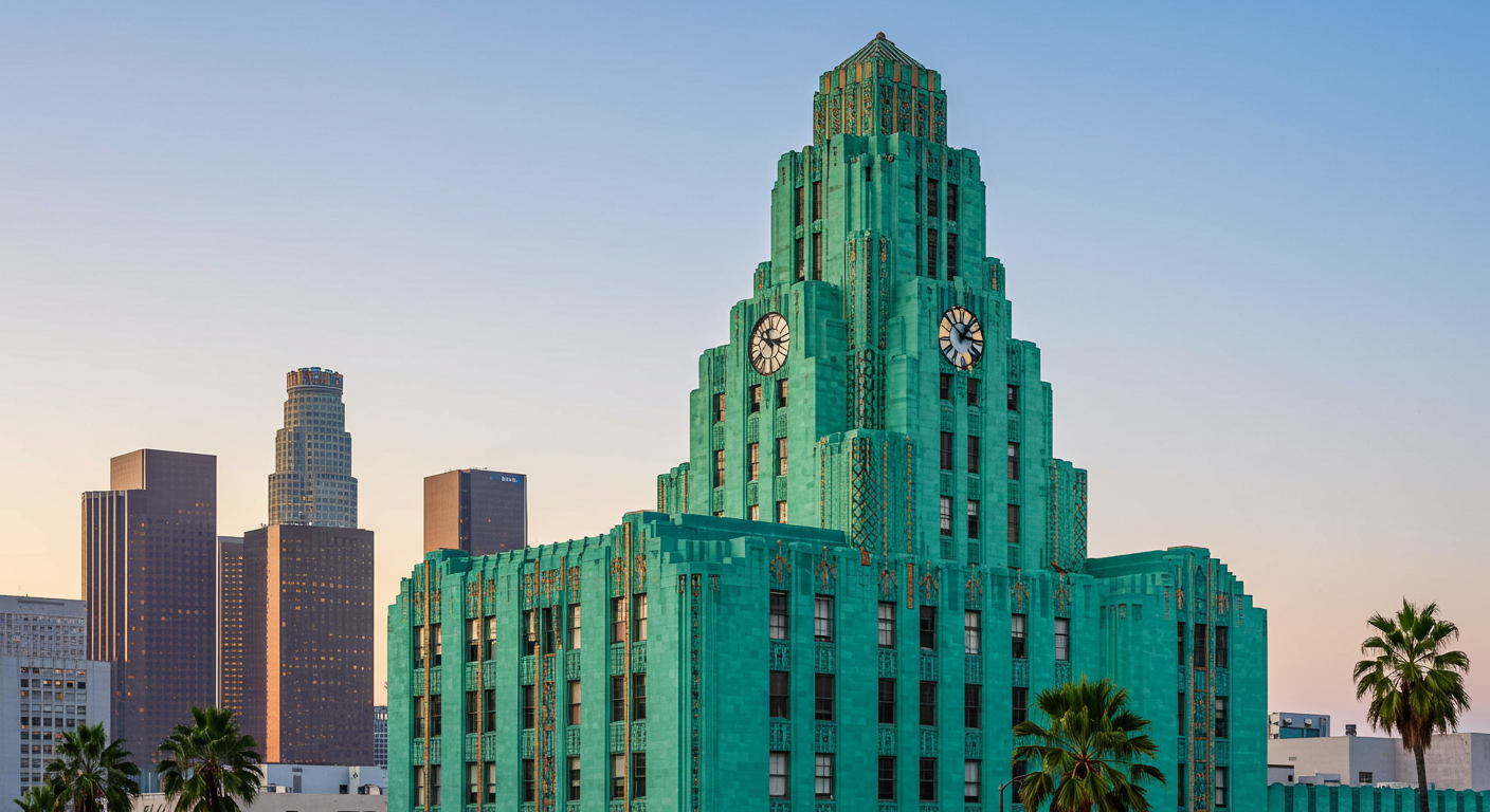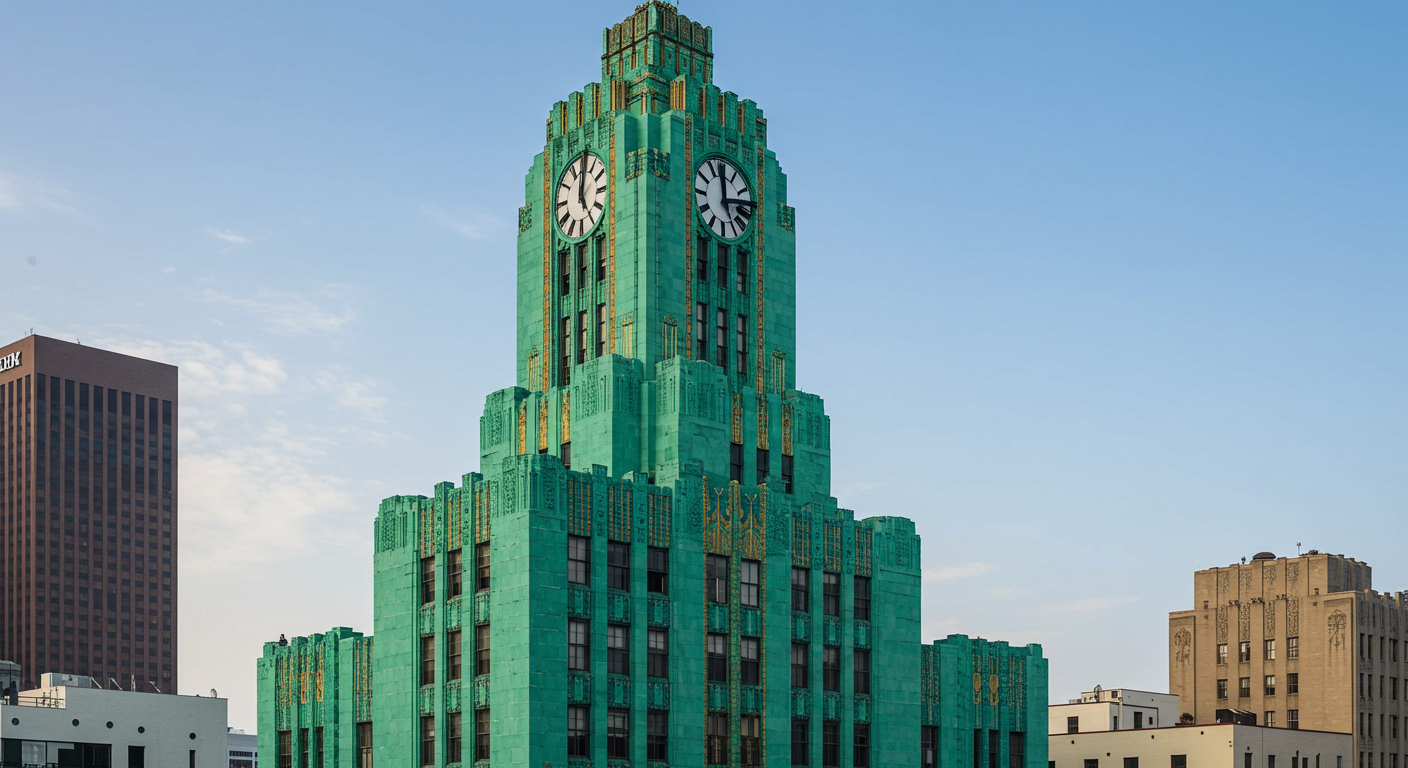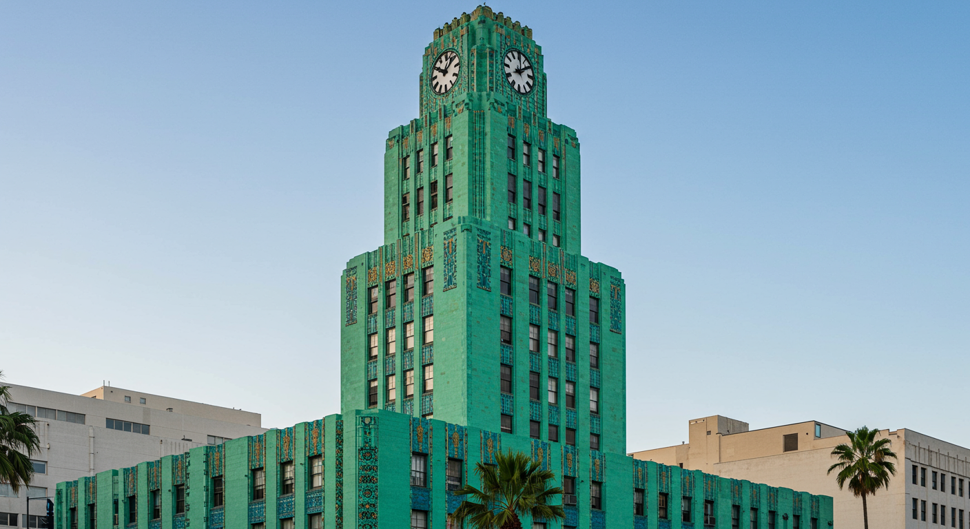 Designed by architect Claud Beelman, the father of notable LA landmark, the Park Plaza Hotel, the Eastern Columbia Building opened in 1930 as the headquarters for the Eastern Outfitting and Columbia Outfitting companies, two popular furniture and clothing retailers, respectively. Since its inception, the ECB has been the the art-deco gem of Downtown Los Angeles’ busy Broadway Theatre district, once considered to be the entertainment capital of the city, before the development of Hollywood in the mid-century. Covered in slick sea-green terra cotta tiles with distinct deep blue and gold accents in a wealth of geometric motifs, the lavish structure remained one of the largest — and most striking — constructions in downtown until well after WWII.