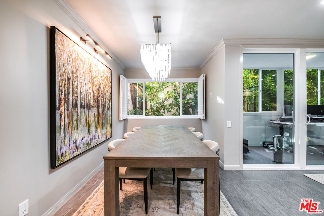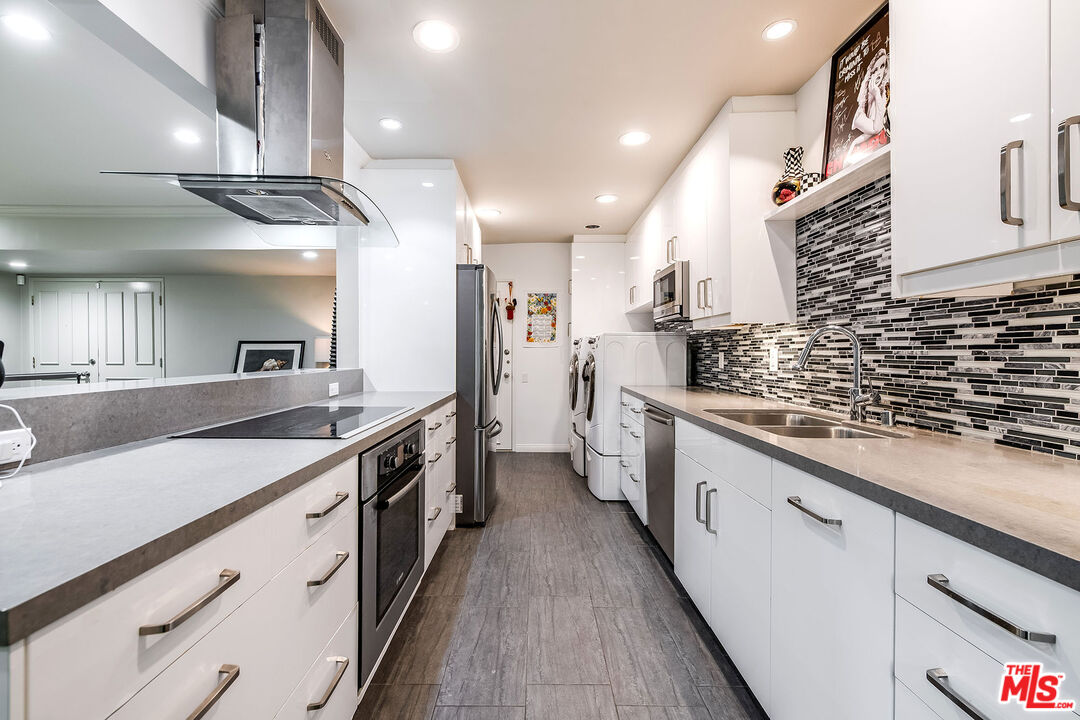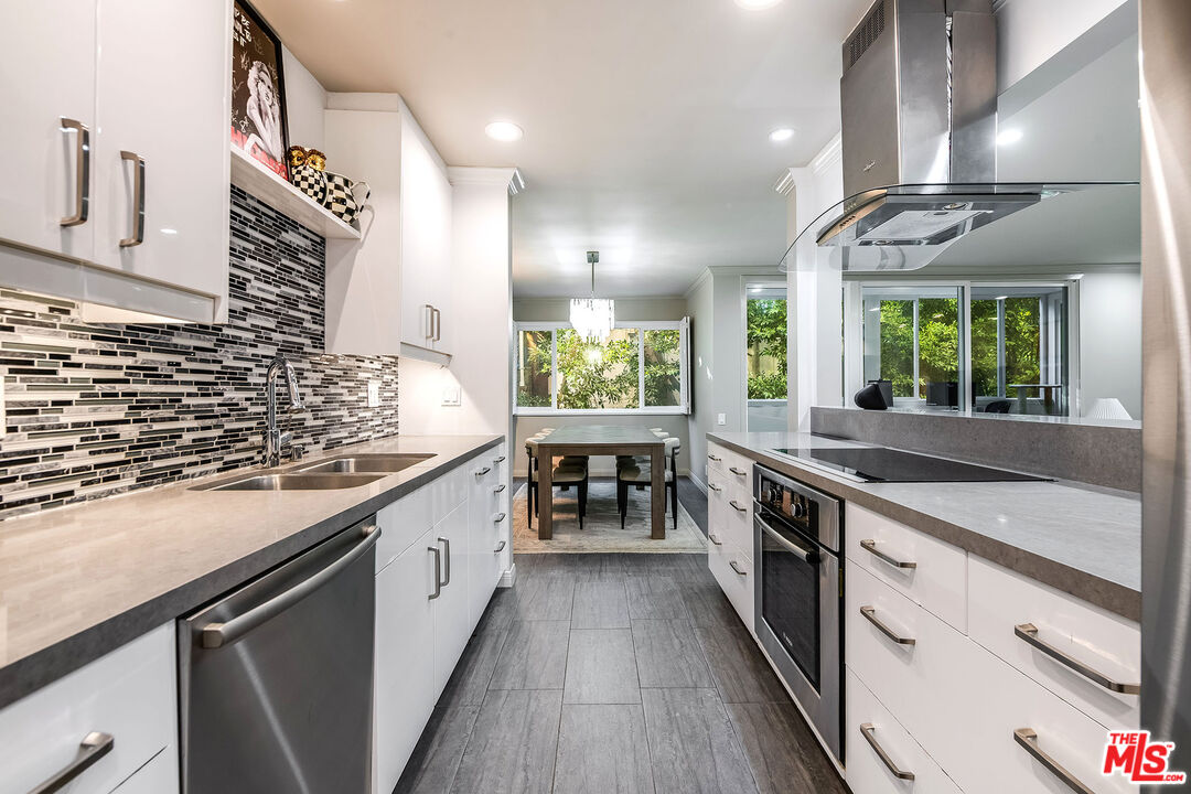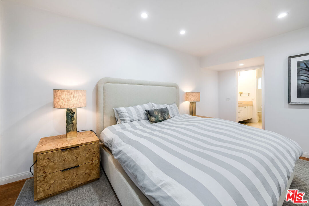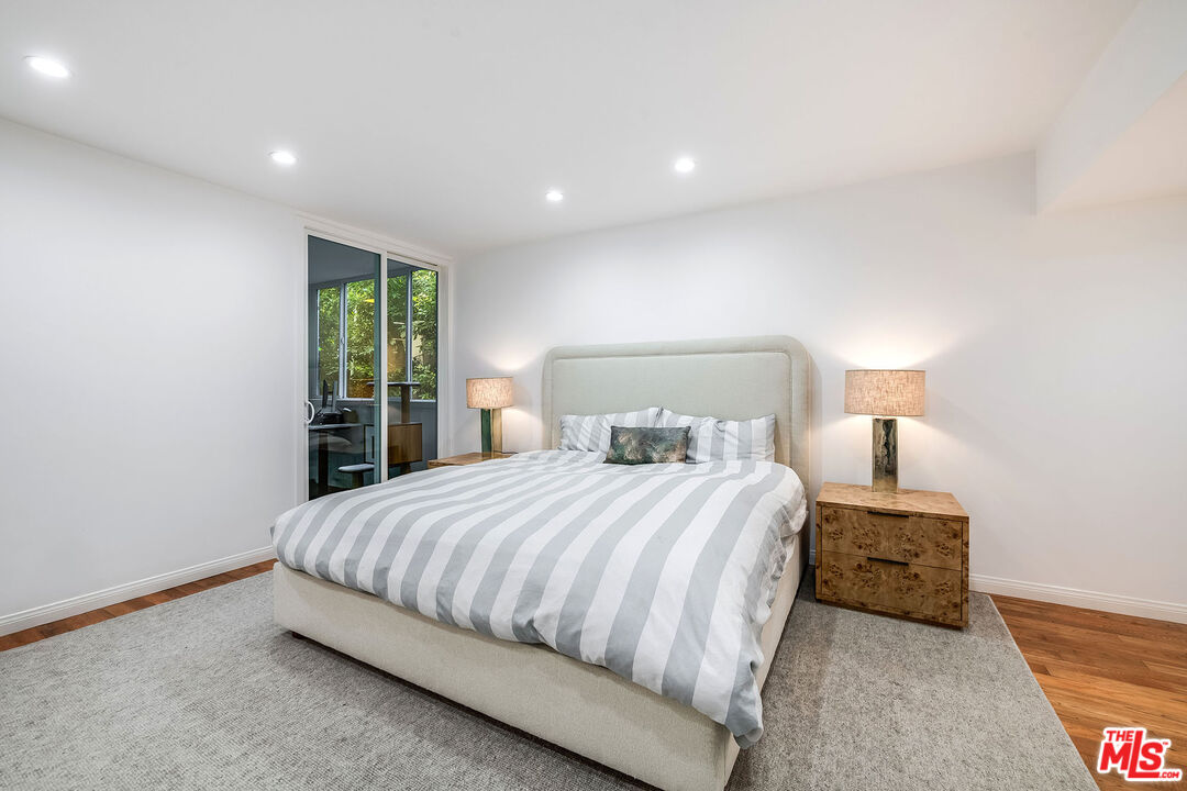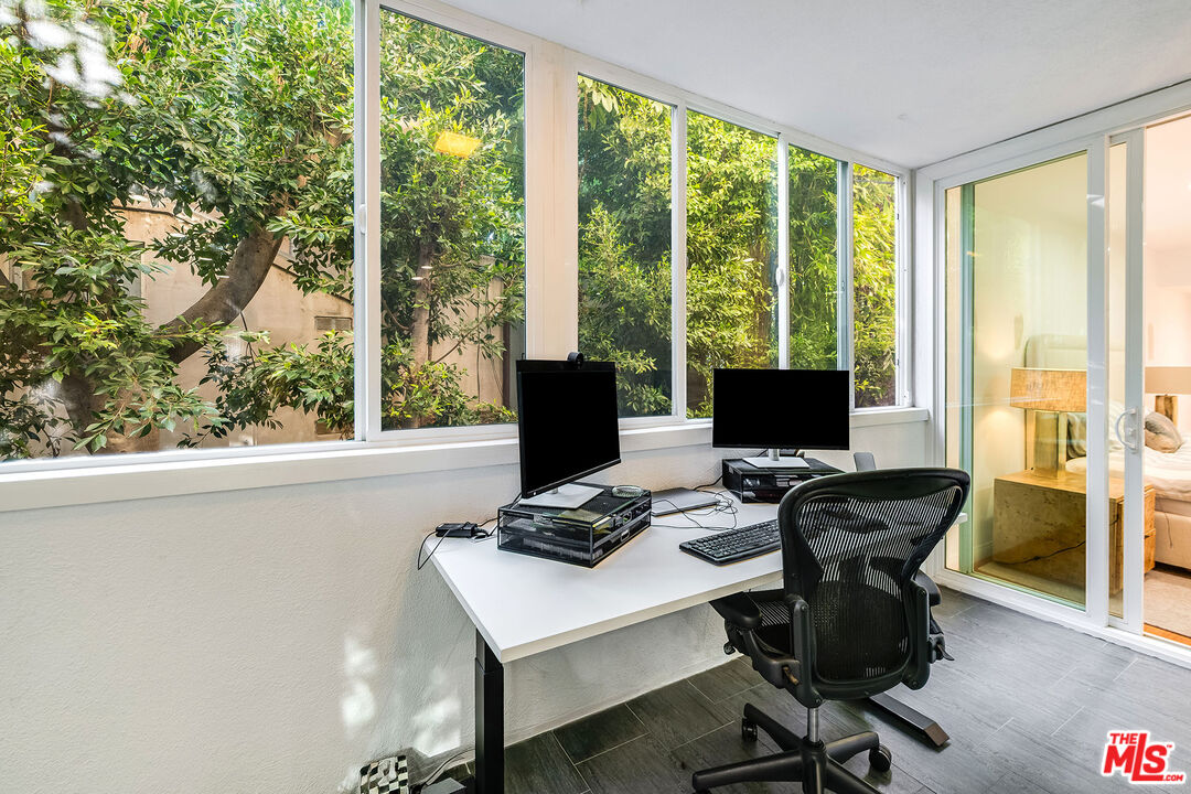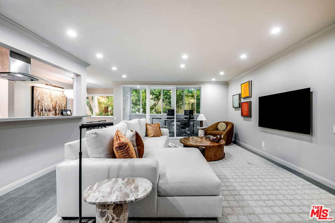 This is a must-see, Spacious, stylish, and super quiet, this 1,409 sq. ft. remodeled 2-bed, 2-bath single-level unit features newer windows with treetop views. CORNER UNIT & Move in ready. The open floor plan includes a modern chef's kitchen with stainless steel appliances, Caesar stone countertops, custom white cabinetry, and ample storage. A great room with floor-to-ceiling glass opens to an enclosed balcony, currently used as a study/office, alongside a separate dining area and breakfast bar ideal for both living and entertaining.The primary suite is a serene retreat with balcony access, a walk-in closet, and a spa-like en suite with a soaking tub and glass-enclosed shower. The second bedroom boasts two large closets, and the elegant second bath is beautifully tiled. In-unit laundry adds convenience. Located in the well-maintained, mid-century 1015 N Kings Road building, this unit offers a sunny pool, tandem parking, and an unbeatable WeHo location steps from Kings Road Park, top restaurants, grocery stores, and nightlife.