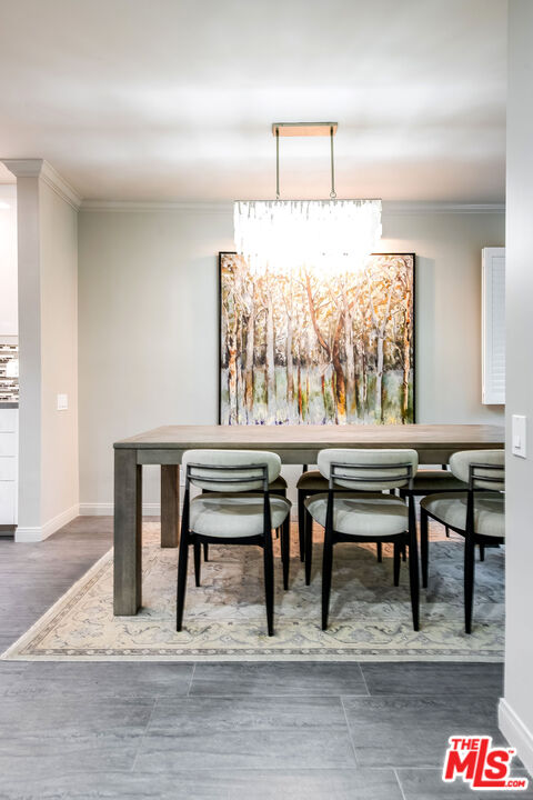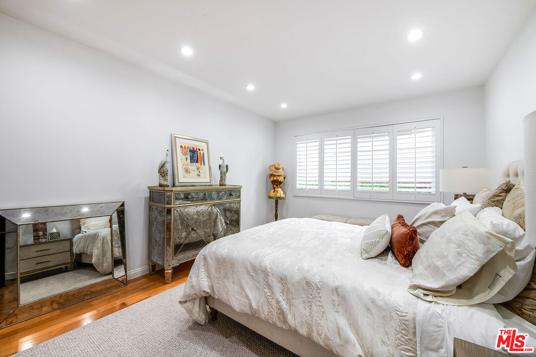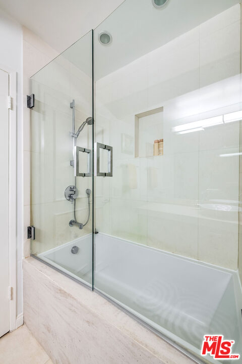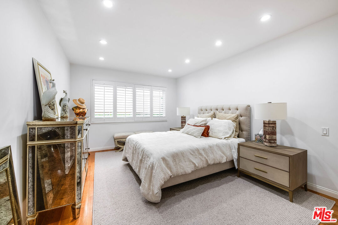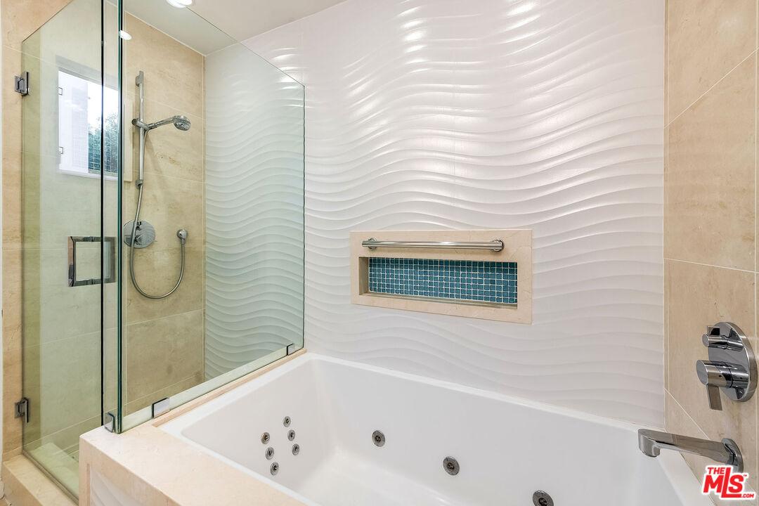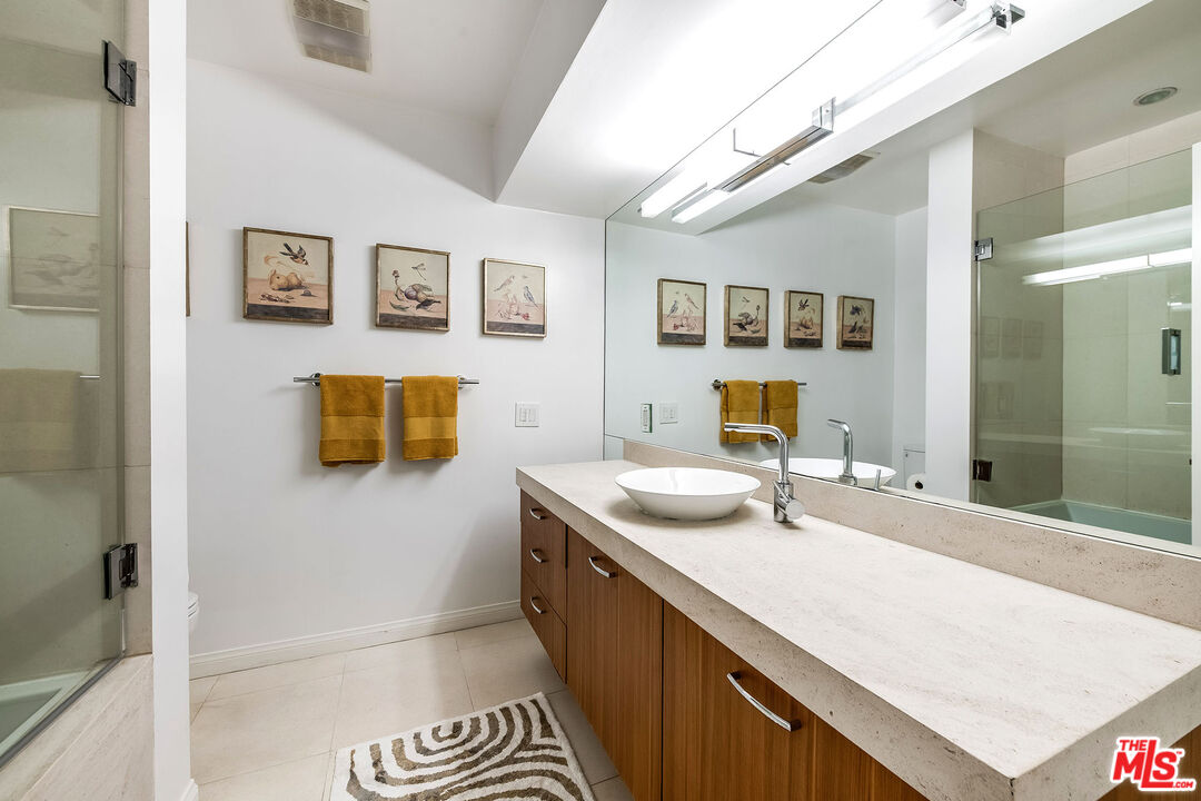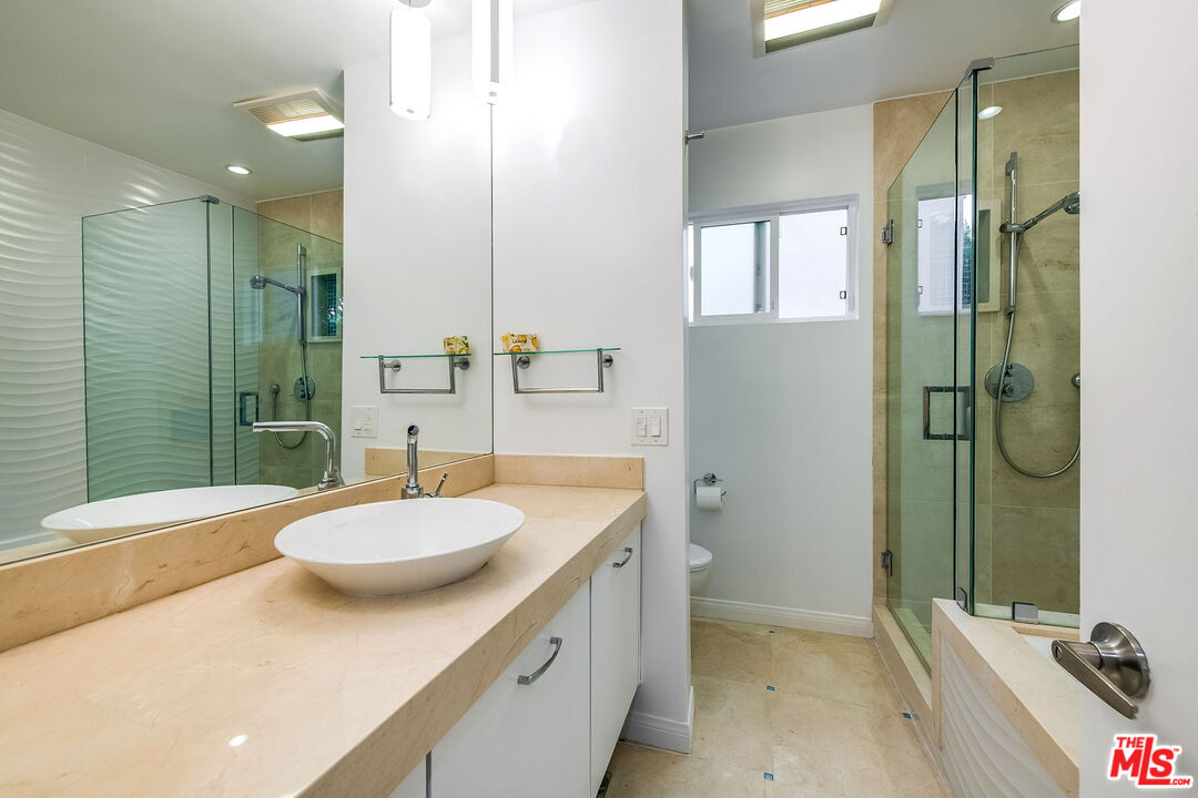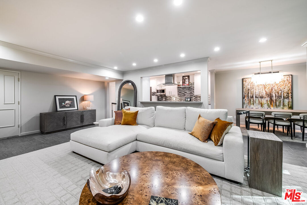 This is a must-see, Spacious, stylish, and super quiet, this 1,409 sq. ft. remodeled 2-bed, 2-bath single-level unit features newer windows with treetop views. CORNER UNIT & Move in ready. The open floor plan includes a modern chef's kitchen with stainless steel appliances, Caesar stone countertops, custom white cabinetry, and ample storage. A great room with floor-to-ceiling glass opens to an enclosed balcony, currently used as a study/office, alongside a separate dining area and breakfast bar ideal for both living and entertaining.The primary suite is a serene retreat with balcony access, a walk-in closet, and a spa-like en suite with a soaking tub and glass-enclosed shower. The second bedroom boasts two large closets, and the elegant second bath is beautifully tiled. In-unit laundry adds convenience. Located in the well-maintained, mid-century 1015 N Kings Road building, this unit offers a sunny pool, tandem parking, and an unbeatable WeHo location steps from Kings Road Park, top restaurants, grocery stores, and nightlife.